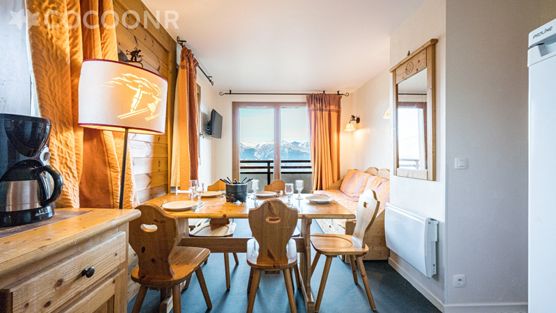 À louer – Appartement rénové au pied des pistes au Corbier ! Situé dans la résidence Les Alpages du Corbier, à moins de 50 mètres du télésiège — idéal pour un séjour au ski ou à la montagne ! Départ ski aux pieds : pas besoin de prendre la voiture, vous partez directement de la résidence vers les pistes ! Belle pièce à vivre avec un canapé convertible (2 couchages) et une cuisine ouverte toute équipée, comprenant notamment un lave-vaisselle. 2 chambres : 1 chambre avec lit double 1 chambre avec lit superposé  Soit 6 couchages au total.  1 salle de bain + 1 salle d’eau  Parking couvert privatif en sous-sol de la résidence, un vrai plus et rare dans la station ! ‍♂️ Accès à la piscine extérieure chauffée (même en hiver !) et au sauna, inclus dans la location. ❄️ L’appartement, rénové et tout équipé, offre un excellent confort et une situation idéale pour profiter pleinement de la station sans voiture.  Le ménage est inclus dans le tarif indiqué — partez et revenez l’esprit tranquille !